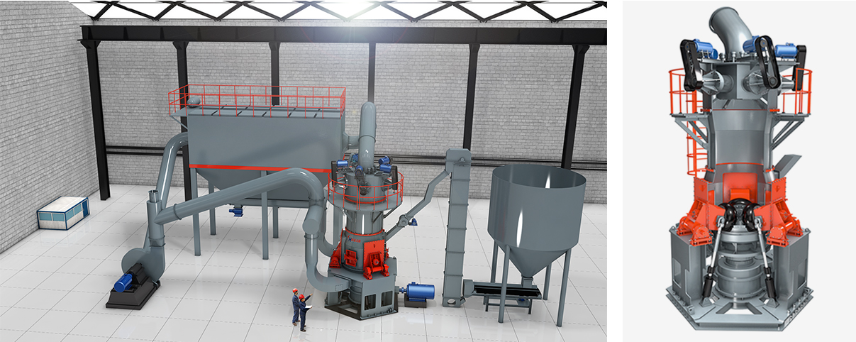 (4)立式磨粉磨系統(tǒng):屬于碾壓粉碎,它在單位時間內(nèi)產(chǎn)生的細(xì)粉量偏少。它的優(yōu)點(diǎn)是采用液壓方式進(jìn)行施壓于磨輥,產(chǎn)生的碾壓壓力很大,因此粉碎效果好,可用于粉碎硬度高的物料。它一般以用來生產(chǎn)1000目以下的產(chǎn)品,部分重鈣設(shè)備企業(yè)如桂林鴻程等在生產(chǎn)中對立式磨進(jìn)行了改進(jìn),改進(jìn)型的超細(xì)立磨可直接生產(chǎn)600目一2500目產(chǎn)品。隨著立式磨干法粉磨與精細(xì)分級技術(shù)在重鈣行業(yè)得到推廣應(yīng)用,近年來超細(xì)立磨工藝技術(shù)成為重鈣加工企業(yè)的理想技術(shù)。其既滿足了重鈣產(chǎn)業(yè)規(guī)模化、精細(xì)化加工的要求,又符合國家節(jié)能減排政策的要求,該工藝技術(shù)將有助于深化重鈣產(chǎn)業(yè)裝備技術(shù)升級。