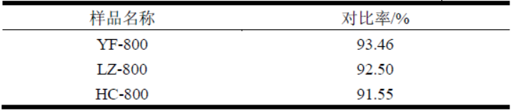 從表中結果可以看出,江西永豐大方解加工的YF-800 碳酸鈣含量最高,雜質元素和重金屬含量最低;連州小方解加工的LZ-800 的SiO2 最低,相對而言對加工設備的磨損也會低;海城白云石加工的HC-800,其成分為典型的白云石成分,其中MgO的含量較多,達到22.43%,碳酸鈣的純度較低,因此粉體一些性能可能會受到影響。
