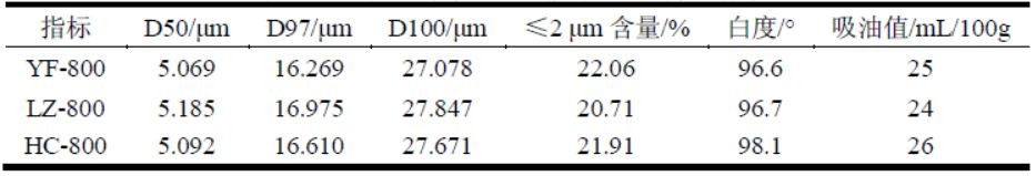 從表中可以看出,三種碳酸鈣的白度都在93 以上,其中采用海城白云石原礦生產的HC-800 的白度最高,達到98.1。從粉體細度上分析,選用相同的生產設備,采用相同的工藝參數生產出的800 目粉體,其粒徑分布基本相同。從吸油值上分析,LZ-800 的吸油值最低,吸油值越低,相對而言對乳液的需求量可能會更小,但是在同等情況下做出的成品可能會偏稀。